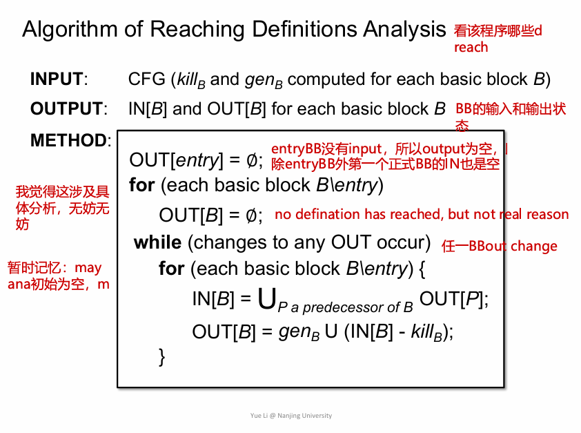 Reaching Defination Anaylsis 算法为什么能停?因为每一个BB的gen和kill不会变,所以IN不变OUT不变。Entry的OUT是空,即除EntryBB外的首个BB的IN被定死了!第一个非Entry的BB的OUT率先不变,带领剩下的BB OUT走向不变