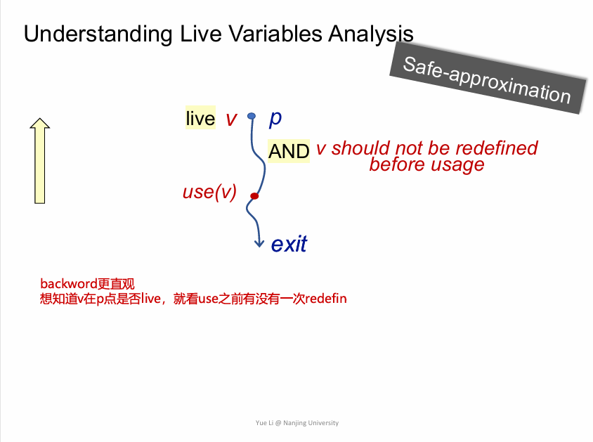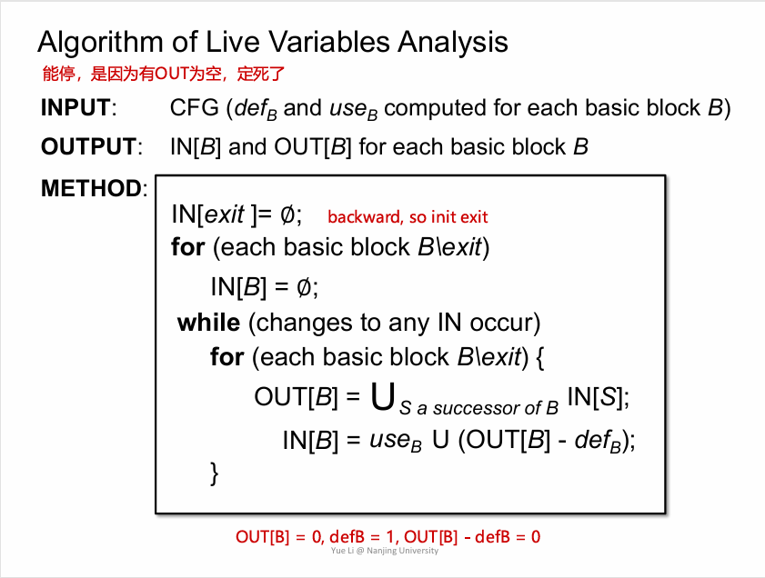 注意:trasfer func不能直接带入useB和defB,因为如果一个BB中先def后use,则在INpoint的v仍是deaf,不会因为BB后部分有v的use而live